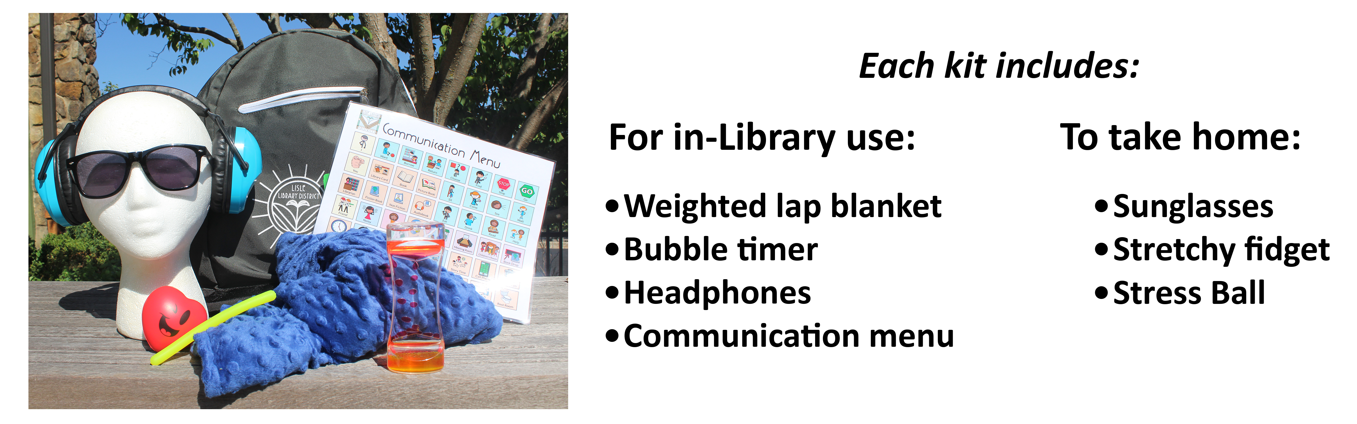 The Lisle Library District is committed to creating a welcoming and inclusive space for all. Our Sensory Cool Down Kits support patrons of all ages, especially those with Autism Spectrum Disorder (ASD) or sensory sensitivities, by helping manage sensory input and promote self-regulation.